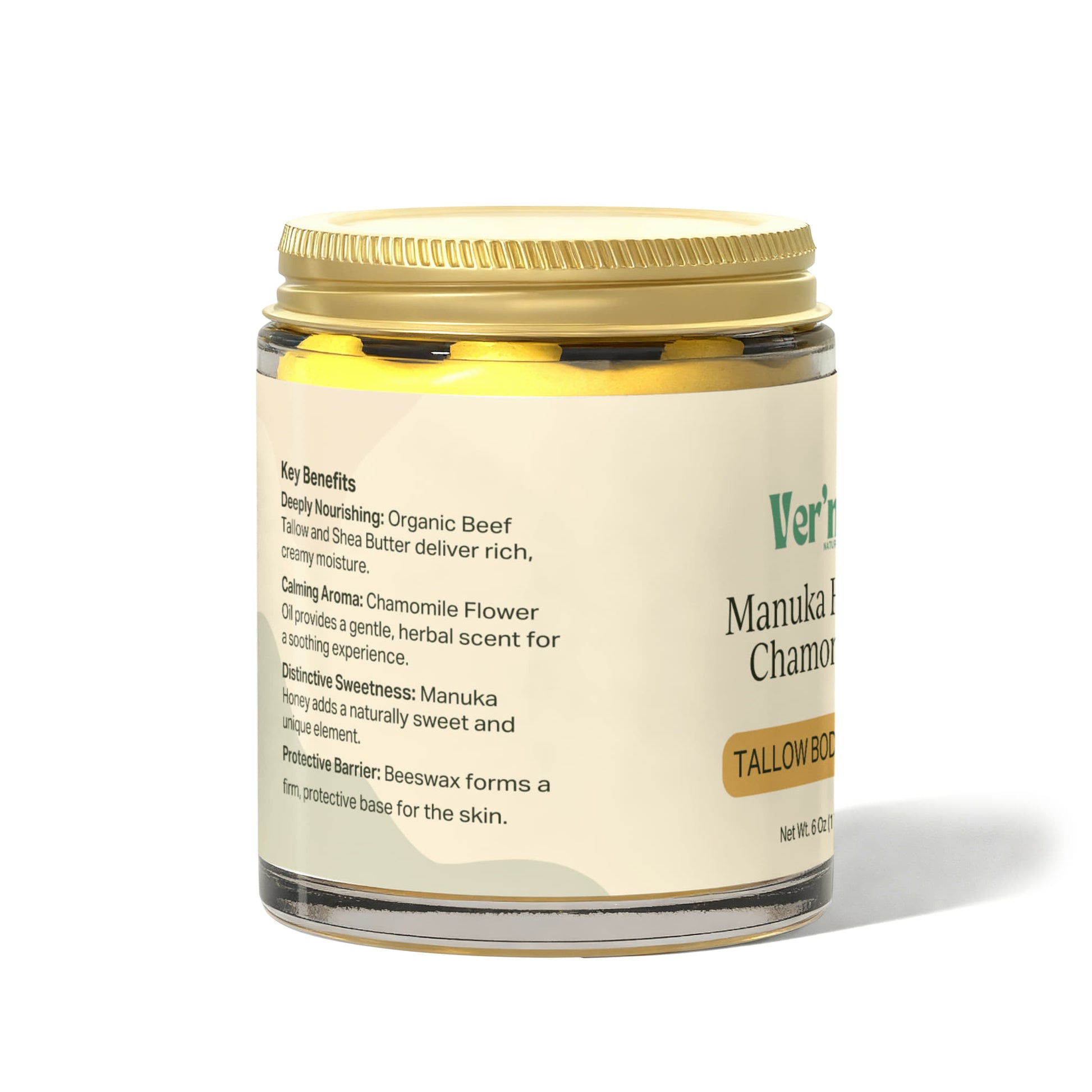 Organic Grass-fed Beef Tallow, Organic Butyrospermum Parkii (Shea) Butter, Daucus Carota Sativa (Carrot) Seed Oil, Mel (Manuka Honey), Organic Cera Alba (Beeswax), Citrus Aurantium Bergamia (Bergamot) Fruit Oil, Anthemis Nobilis (Chamomile) Flower Oil.
