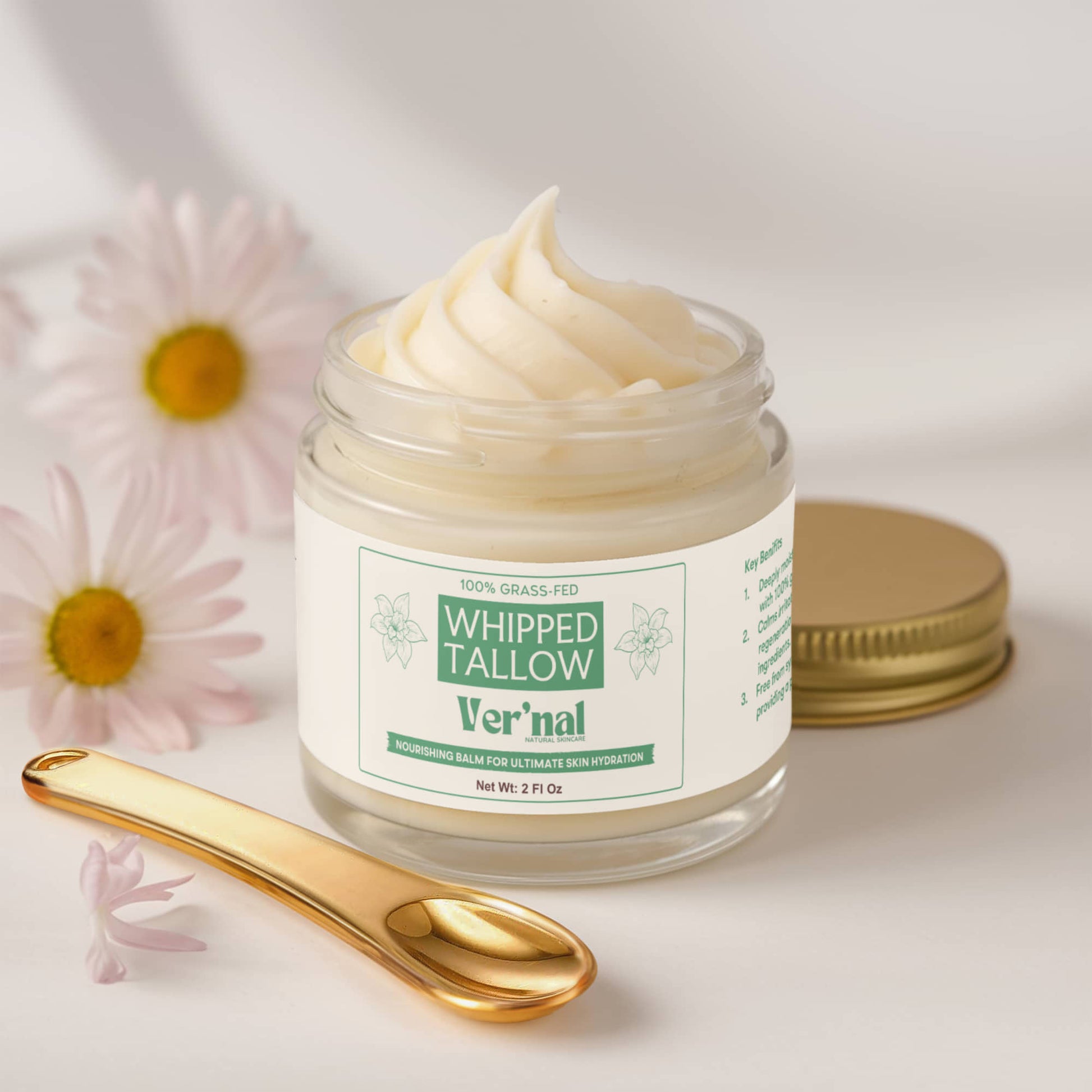 Grass-Fed Tallow - Rich in skin-compatible fatty acids and vitamins A, D, E, and K, it deeply nourishes and repairs the skin, restoring moisture balance, improving elasticity, and strengthening the skin barrier for long-lasting hydration.